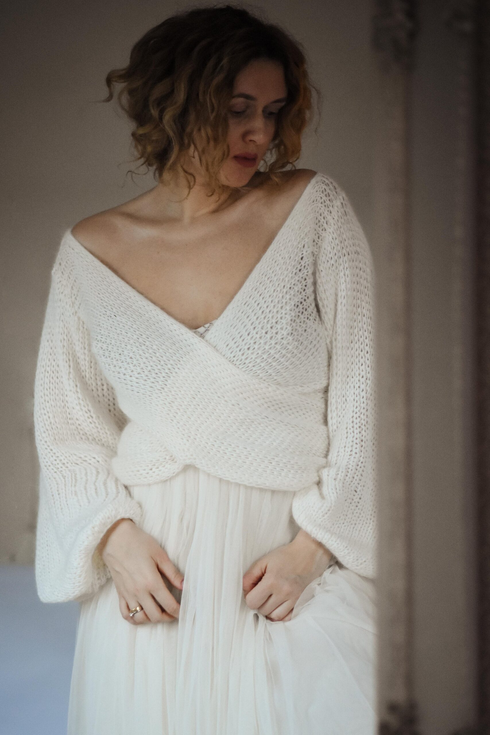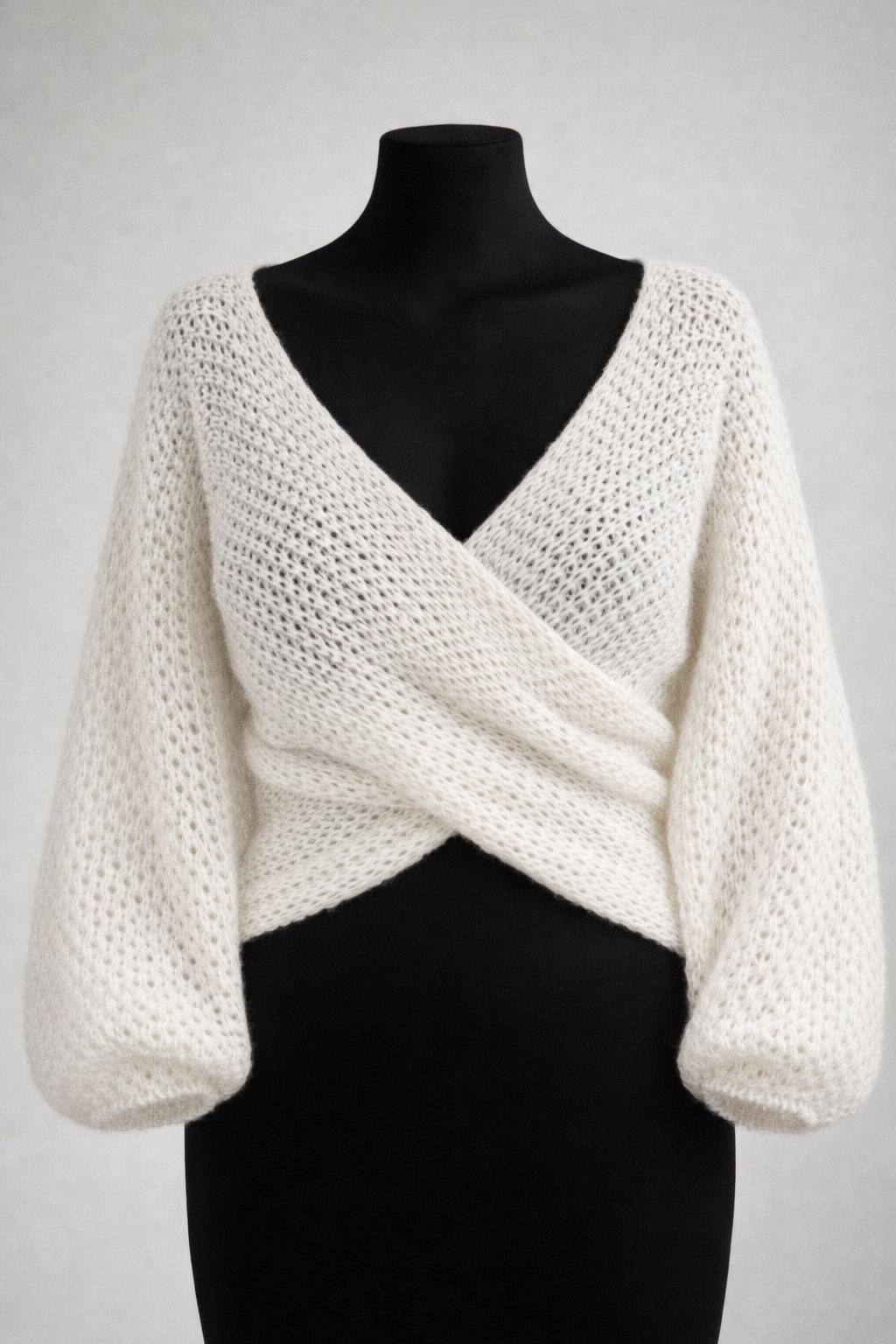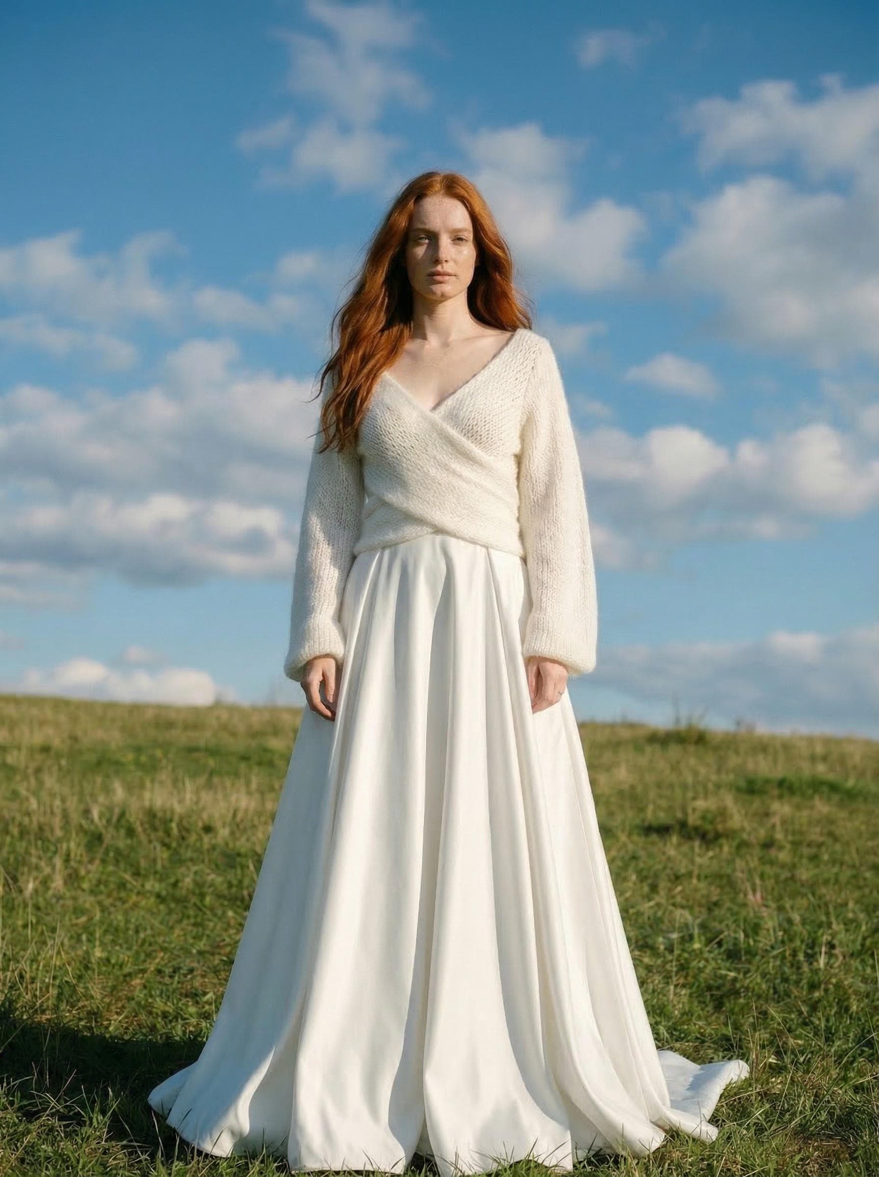 A soft, airy bridal sweater handcrafted from a luxurious mohair, silk and viscose blend. Designed with a flattering cross-front silhouette and romantic balloon sleeves, it adds warmth without weight — perfect for a modern, elegant wedding look.