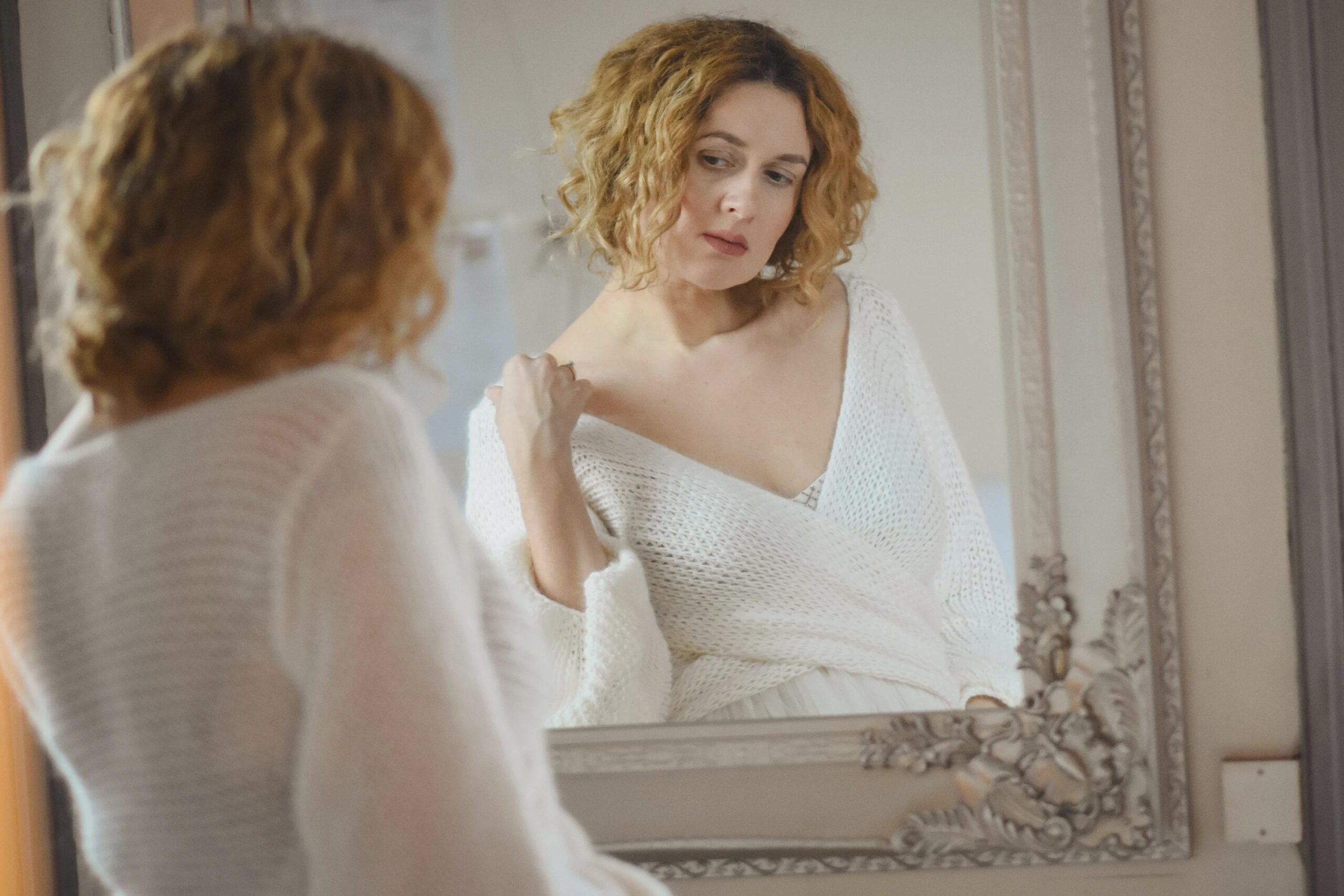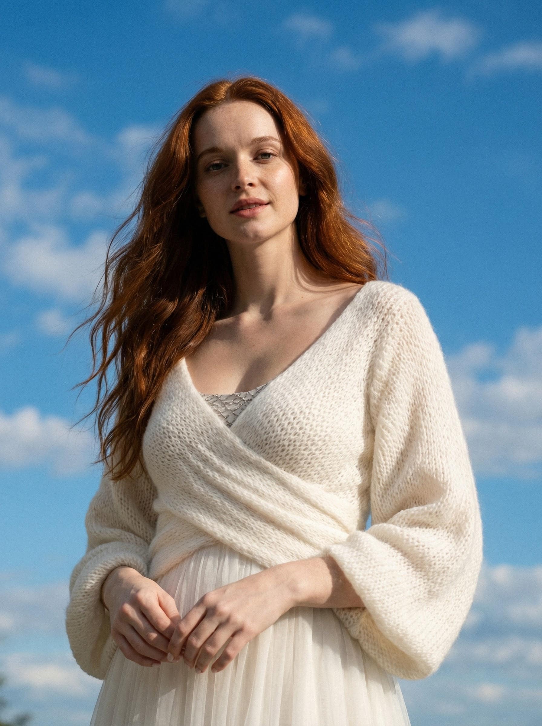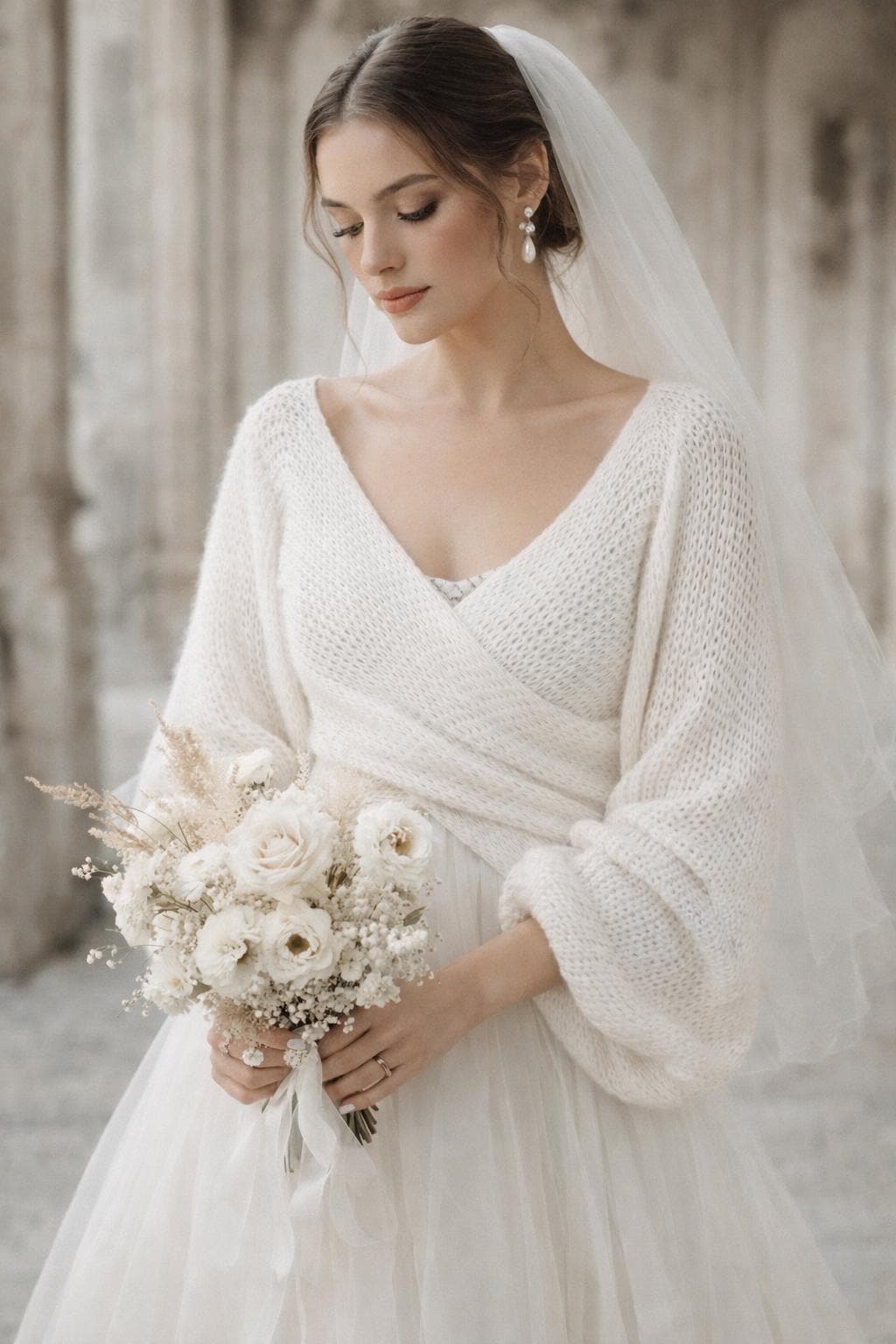 A soft, airy bridal sweater handcrafted from a luxurious mohair, silk and viscose blend. Designed with a flattering cross-front silhouette and romantic balloon sleeves, it adds warmth without weight — perfect for a modern, elegant wedding look.