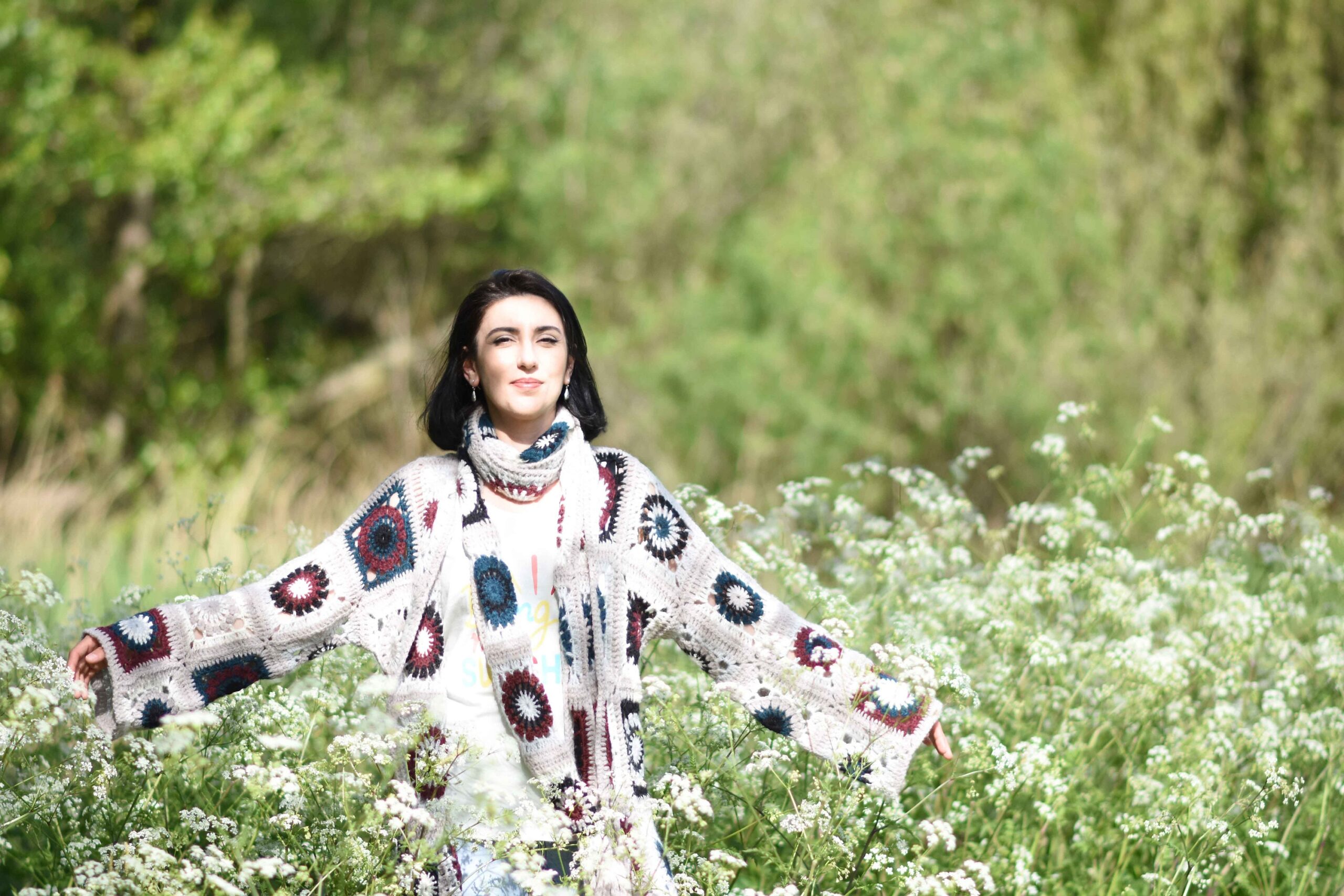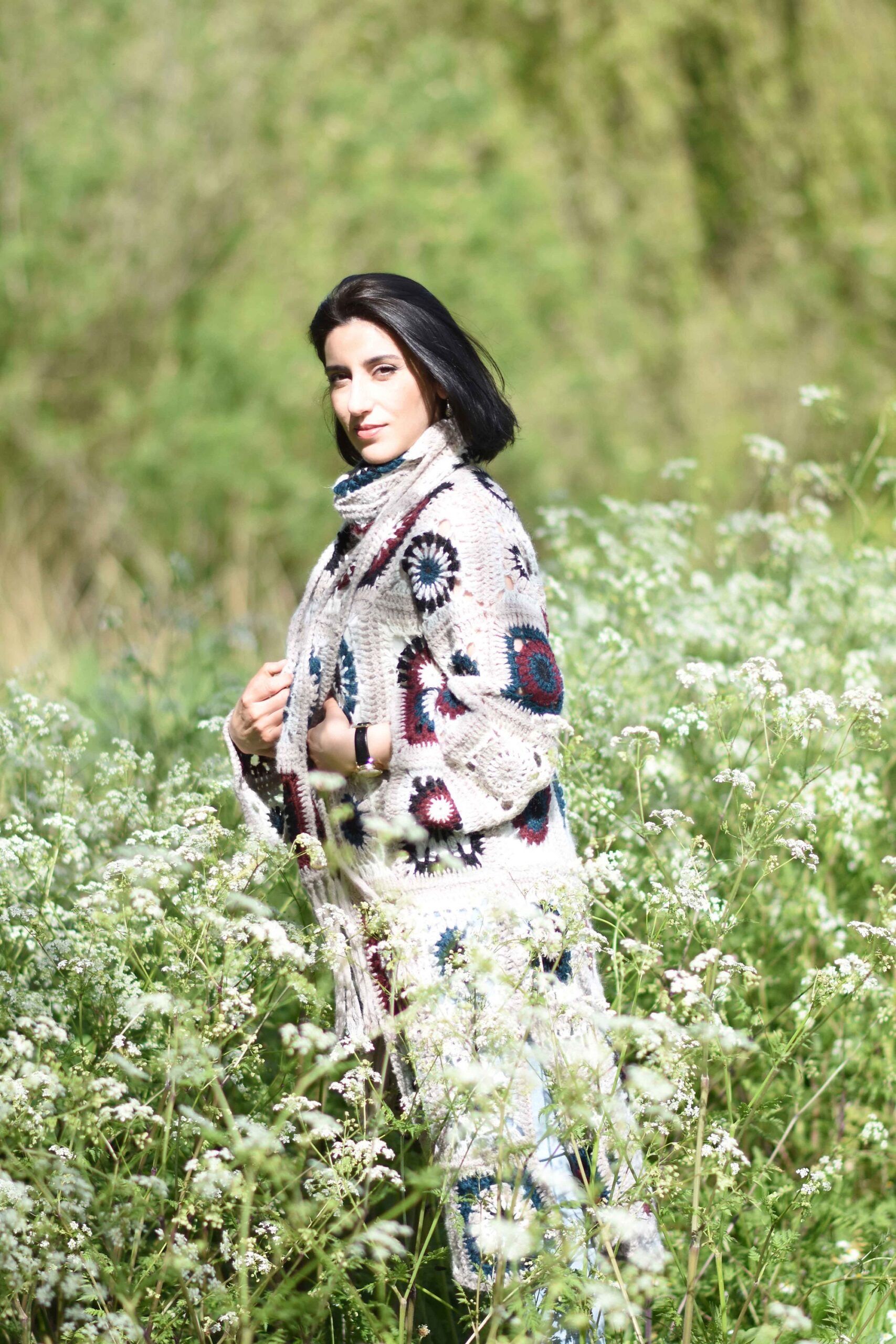 Crochet BOHO Granny Square Jacket longline Cardigan Coat and Matching Scarf