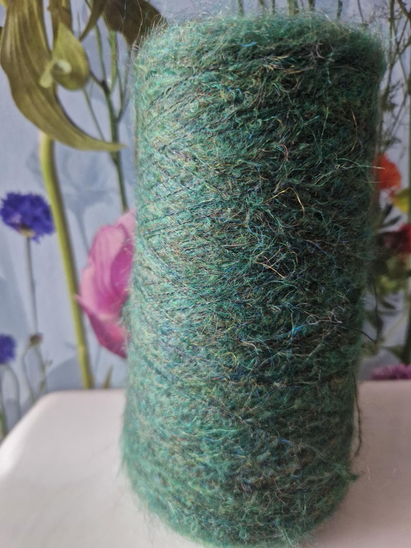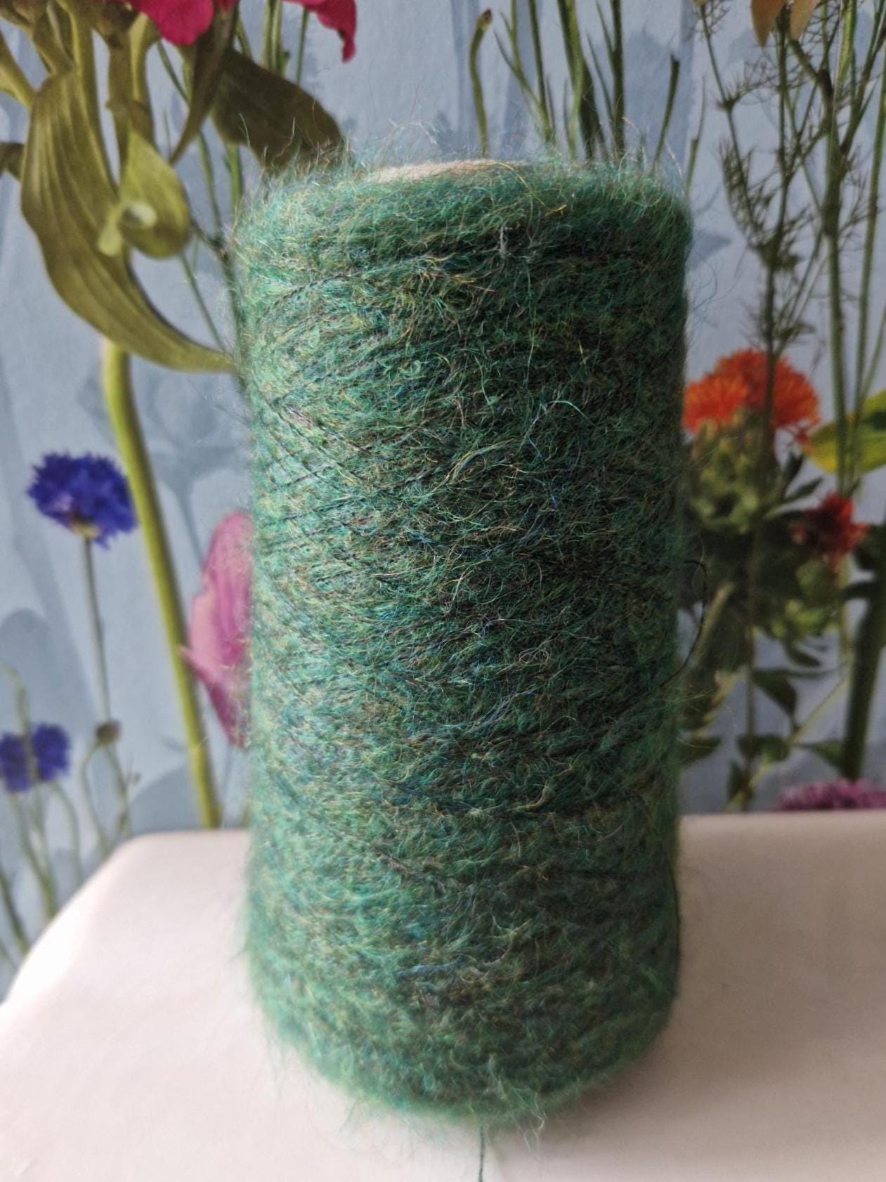 Striking mohair blend yarn in a rich green melange tone.
