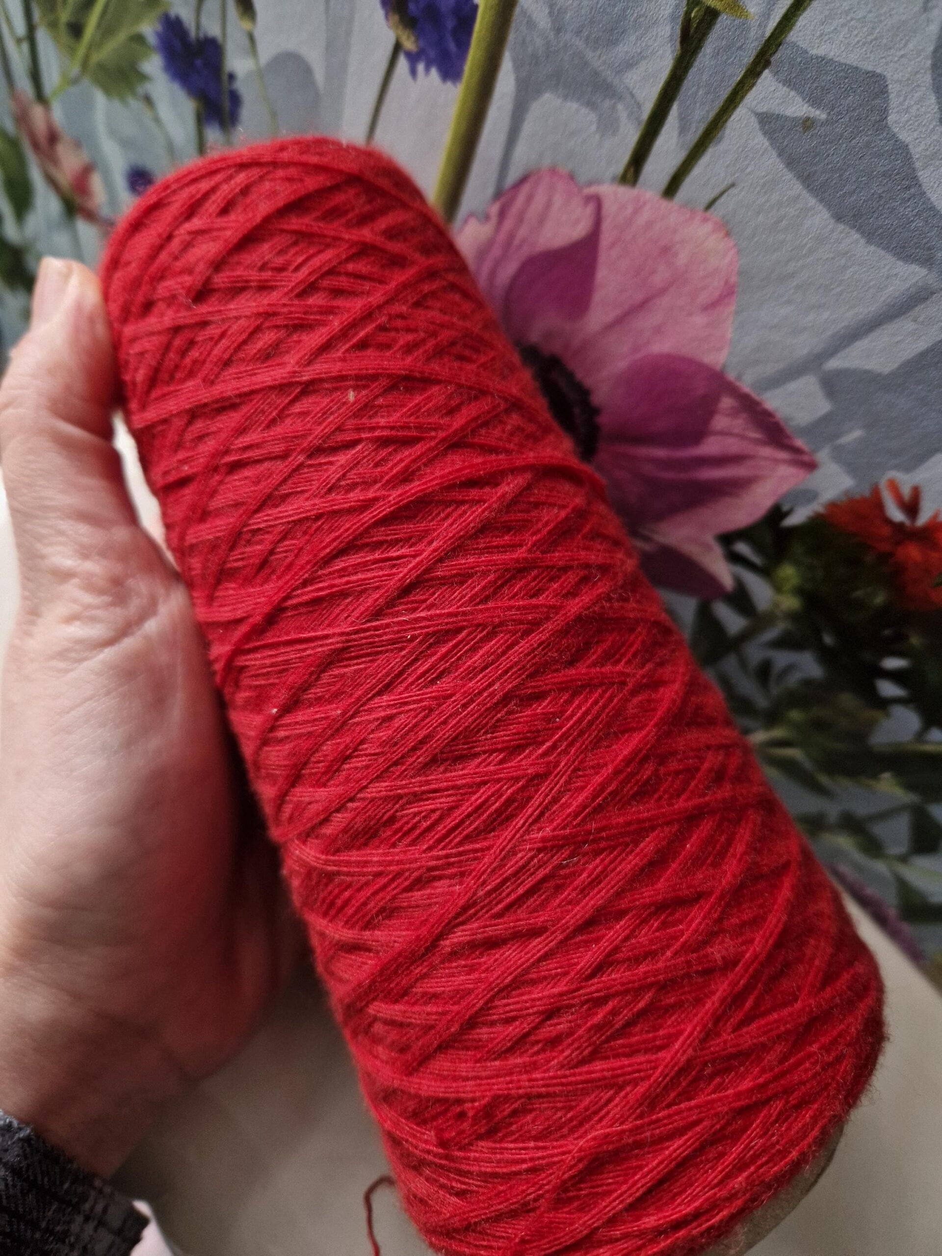 Beautiful luxury Italian yarn cone in a rich, vibrant red (Rosso).