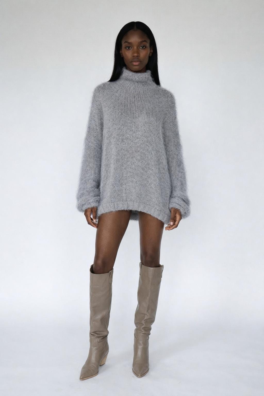 This piece is designed to feel light, soft, and effortlessly elevated — with a delicate fuzzy halo that gives it that signature mohair glow. The oversized silhouette and high turtleneck create a relaxed yet striking look, perfect as a statement piece or layered styling.